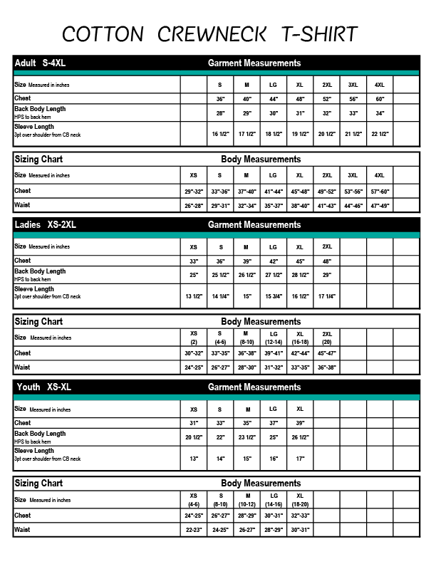 Ladies : XS, Sm, Md, Lg, XL, 2XL